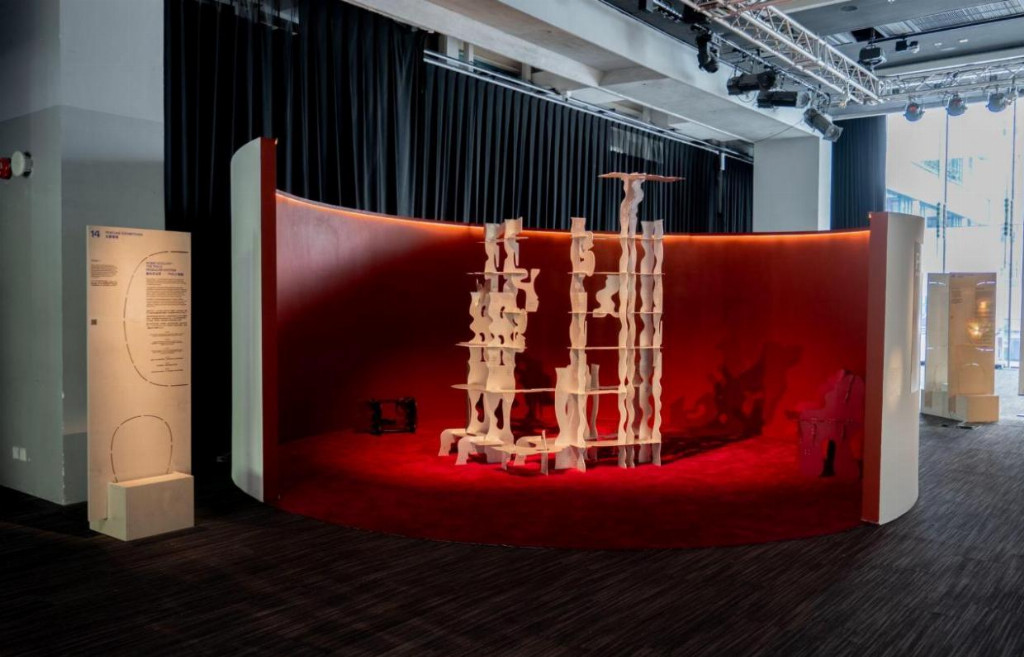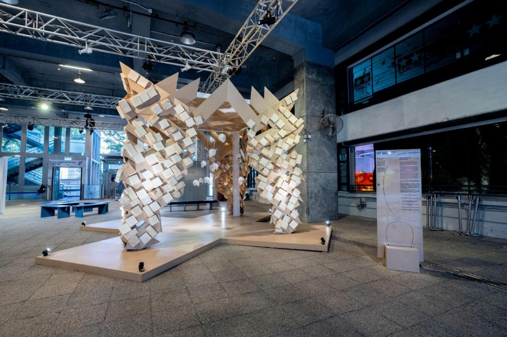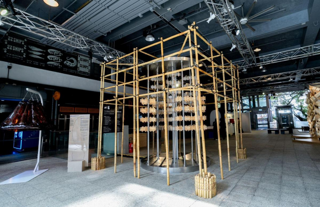 设计团队零界点设计的《竹茧》追溯香港竹棚的历史记忆,结合“天圆地方”理念。“地方”部分外露机械轴承嵌入文献,形成“可触摸的地方志”;“天圆”部分为中央圆形空间,观众转动竹轴可启动数控水雾装置,温感0101编码会时而出现、时而消失,扫描二维码还能查看竹材的文化故事,让历史与未来在此交融。