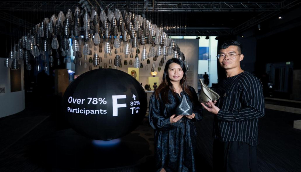 《花・织象》是由香港注册建筑师张家豪和花艺设计师黄莹莹携手创作,观众提交MBTI测试结果后,系统会将性格数据转译为3D打印花瓶,另一件加入展览的“球体装置”(由超过450个花瓶组成,直径2.5米)。搭配花艺创作环节,让抽象性格成为承载个人故事的美学载体,满足“被看见”的深层渴望,包容每个人的不同。