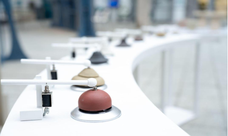 邓芷蔚的《([[o]]) Bells》展示了形态各异的陶艺装置,每件陶泥物件触碰后会发出独特共鸣声。通过“触觉——听觉”的联觉体验,让观众在数字化时代重拾真实感官连接,对抗“屏幕交互”带来的触觉疏离。