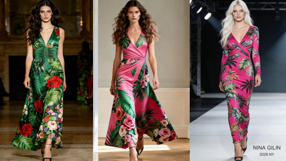 NINA GILIN 本次主推的高级定制印花晚礼服,堪称“工艺与美学的双重盛宴”。设计团队摒弃传统高定的厚重感,借鉴 Georges Hobeika 的“轻雕塑感”理念,选用意大利真丝绡、法国水溶蕾丝和高科技人造丝等顶级面料,让印花在轻薄织物上呈现出通透灵动的质感。印花图案分为两大系列:“感恩繁花” 以玫瑰花为灵感,采用数码刺绣与手工钉珠结合的工艺,花瓣边缘缀以细闪碎钻,行走时如星光流淌;“海岸梦境”则提取西棕榈滩的海浪、沙纹元素,通过渐变印花技术营造光影流动感,在裙摆层叠处融入南美绒羽,轻盈如海风拂过。?