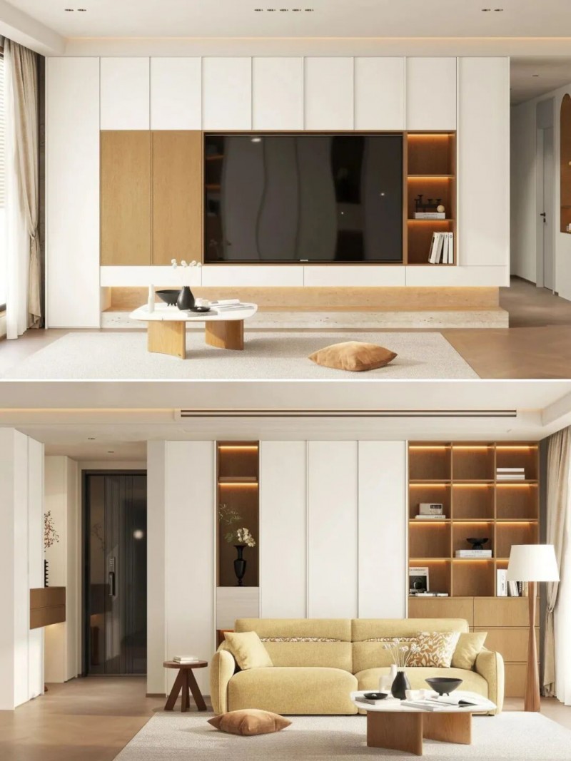 采用嵌入式结构、无拉手门板以及藏露结合的半开放形式,能让日常物品轻松“隐身”,从而维持视觉上的极度清爽与整洁。