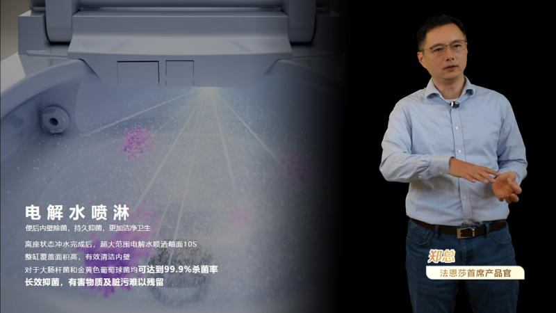 “法恩莎T60净菌卫士,以全链路闭环净菌体系革新行业认知。从座圈一水路—洗护一水封一净味—釉面的全场景健康守护,推动智能卫浴从‘单一功能升级’向‘全流程健康赋能’的变革。” ——法恩莎产品首席官郑旭