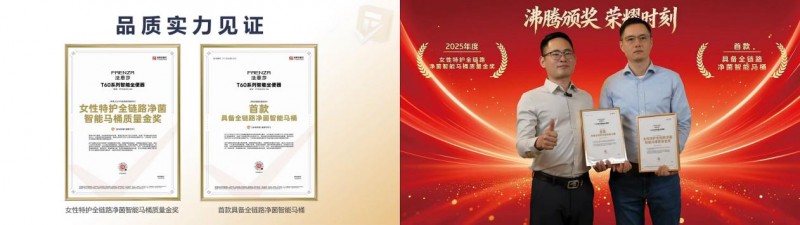 法恩莎T60净菌卫士凭99.99%净菌实效,全链路净菌+女性特护场景适配,填补全流程洁净与细分场景空白,引领行业向精准化、高品质升级。经沸腾质量测评评定,特授「首款具备全链路净菌智能马桶」与「女性特护全链路净菌智能马桶质量金奖」。