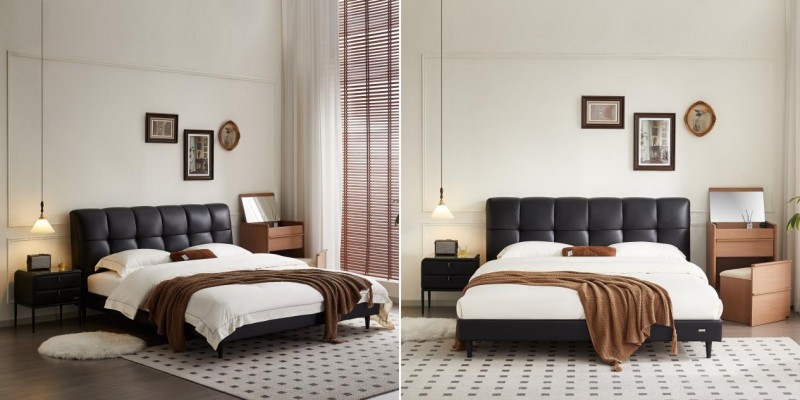 包豪斯风软床,灵感源自包豪斯美学,适配中古、孟菲斯等风格空间。焦糖暖棕框架与质感雅黑软包撞色搭配,演绎复古摩登气息。面料采用质感生态皮,日常打理一擦即净,美观与实用兼具。