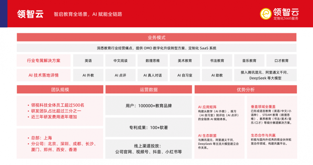 服务超10万家教育机构,涵盖英语、中文阅读、数理思维、美术教育、书法教育、音乐教育、口才教育等细分赛道,形成可复制的跨学科赋能模型。