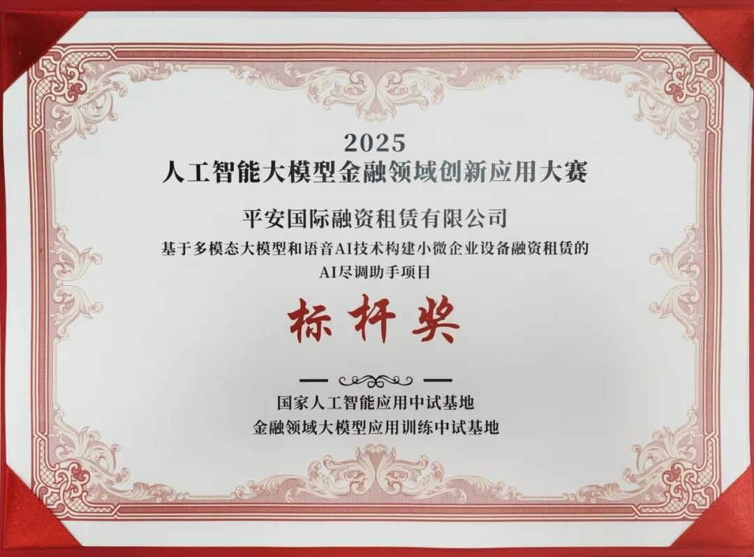 近日,平安国际融资租赁有限公司(以下简称“平安租赁”)两项人工智能金融创新应用项目在上海市级评选中接连斩获重要奖项,“基于多模态大模型和语音AI技术构建小微企业设备融资租赁的AI尽调助手项目”获2025年人工智能大模型金融领域创新应用大赛“高价值场景赛道(资本市场组)标杆奖”;“小微企业智能营销与风控一体化解决方案”获2025年上海金融系统职工金融科技创新应用大赛“优胜奖”。这一系列荣誉是行业对平安租赁积极探索金融大模型落地应用的认可与肯定,也是平安租赁积极做好“五篇大文章”的生动体现。