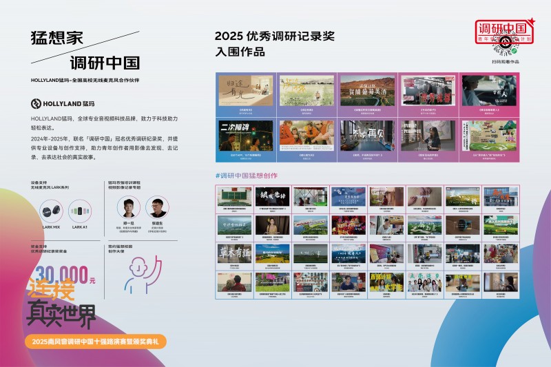 企业社会价值的核心,在于对人的关注与赋能。2025年,猛玛与《南风窗》联合发起“调研中国校园创作大使计划”,向百余支大学生团队提供专业无线麦克风设备,支持他们深入基层田野,记录真实社会现象。从《听障群体的数字困境》到《边疆电商突围》,年轻创作者们用声音与影像让沉默议题被聆听,让边缘故事被看见。最终入围的十部纪录片,如同十扇窗口,展示了多元而真实的中国面貌。