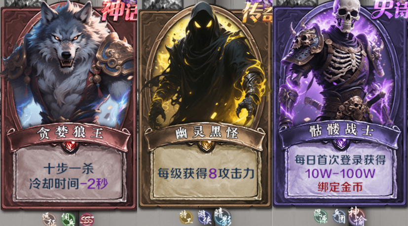 越是高级的英灵,能力就越广泛,比如史诗英灵里的骷髅战士能给玩家额外带来金币收益;传奇英灵的幽灵黑怪会让攻击力随等级升高,越到后期越强悍;还有神话英灵的贪婪狼王,能降低玩家的“十步一杀”CD,让你出手总比别人快一拍,赢在起跑线上。