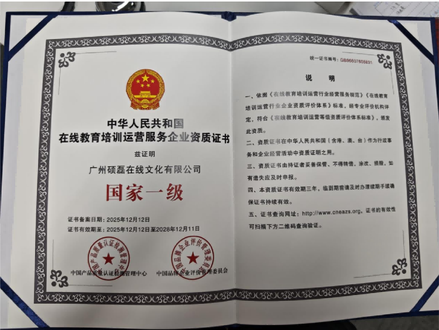 随着在线教育日益成为终身学习体系的重要组成部分,行业的规范化、专业化发展备受关注。近日,广州硕磊在线文化有限公司在教育服务专业资质领域取得突破性进展,成功荣膺“中华人民共和国在线教育培训运营服务企业资质证书”,并被评定为最高等级的“国家一级”资质。这一由国家权威产品质量认证检测管理机构颁发的资质,标志着硕磊在在线教育培训运营的服务能力、质量体系、技术保障和规范管理等方面,均已达到国家设定的高标准、严要求,获得了最高级别的官方专业认可。
