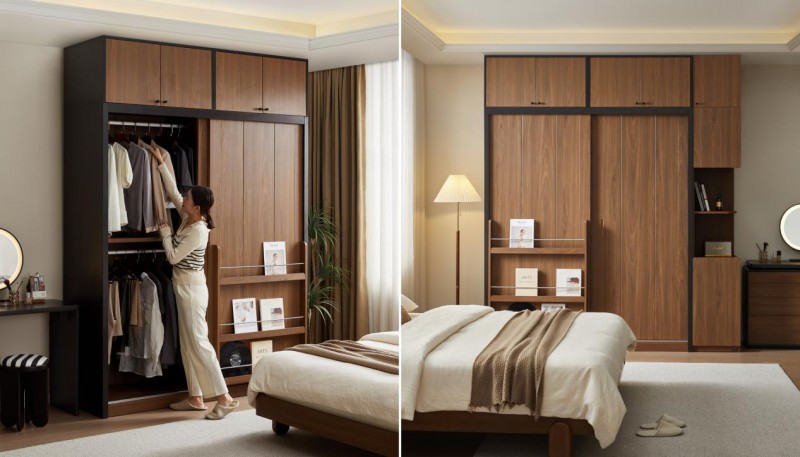 胡桃木纹移门衣柜,节省过道空间;衣柜提供多规格选择,可自由组合边柜、顶柜,大幅提升收纳容量,适配不同大小卧室。内部配备皮质衣通与收纳篮,明确划分悬挂区与折叠区,衣物取放一目了然。加长实木拉手,温润雅致,凹槽设计方便抓握。外侧金属挡条设计成杂志架,增添时尚感,实用美观。