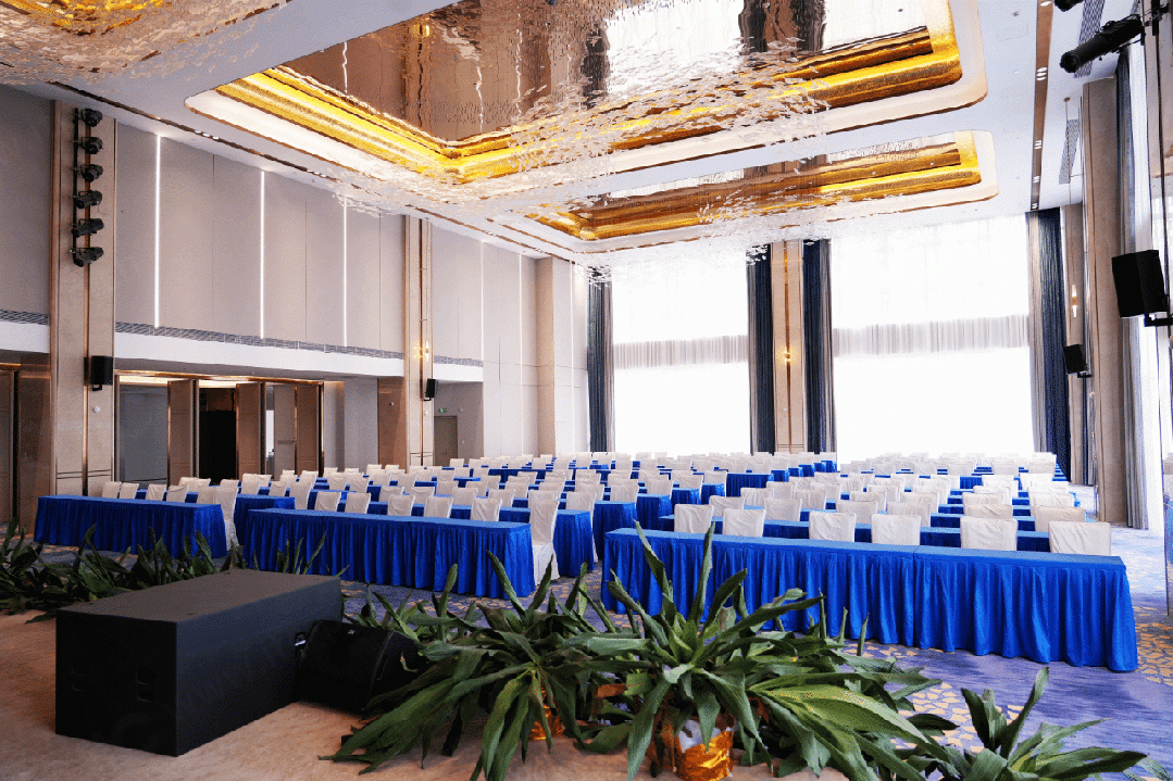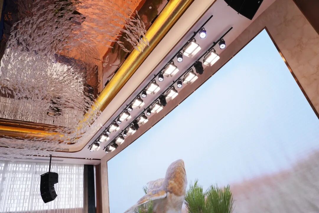 加中生物科技多功能会议厅场地面积较大,可容纳300余人,为了保证整个会场内充分的声压级, itc采用了2组线阵列全频音箱作为会场主扩声,分别吊挂于主席台两侧,对观众席实现精准的大面积声音投射,为会场提供高清晰度和高穿透力的声音覆盖。同时配备辅助、返听、台唇、超低频音箱,实现宽广区域的无死角覆盖,确保从台口到后排的每位观众都能获得均衡一致的声场体验。