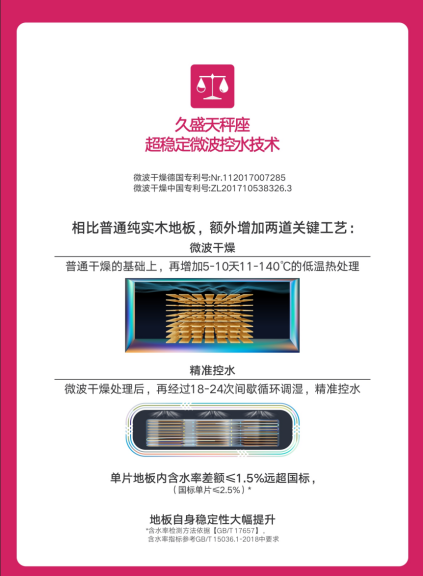 伴随全屋通铺、去龙骨安装、干燥潮湿环境应用等多元与复杂场景的出现,纯实木地板的稳定性成为了关键痛点。久盛凭借在纯实木领域连续多年的技术深耕,于2025年发布两项核心超稳定技术,使产品稳定性提升60%,这为此次品牌战略升级提供了坚实的技术底座,也完成了从“地暖专用”到“全场景适用”的价值跨越。