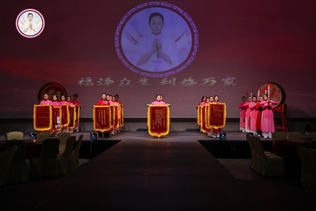 灯光渐暗,御妙心二十年历程在大屏上一一呈现,从创立初心到万家信赖,身着统一服饰的妙心人带着一面面写满感激的锦旗,无声却有力地诉说着时间的力量。每一面锦旗,都是一个家庭的健康故事,一次生命的蜕变记录。他们的表演,没有复杂的编排,是将日常工作中 “五正五心” 的精神——道心、德心、仁心、善心、慈悲心,融入灵魂。这一群平凡又不平凡的年轻人,将“五正五心”转化为一双双温暖的手、一个个日夜的坚守。他们用青春守护他人的健康,而客户的健康与感激,则成了照亮他们职业价值的光芒。