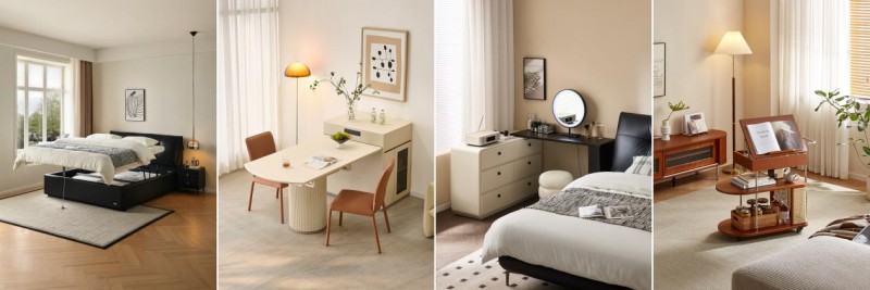 自带储物空间的箱体软床,换季被褥、行李箱轻松收纳;可折叠岛台餐桌,日常收起不占地,亲友欢聚时秒变大气餐桌,侧面预留收纳格,餐具随手可取;书桌妆台一体设计,可一字型靠墙办公,也可L型布局变身梳妆区,收纳储物一步到位;可移动小边几,客厅卧室随意切换,既是茶几又是床头柜,灵活适配每个角落。从客厅到卧室,从收纳到功能,精准破解小户型拥挤、收纳不足的痛点,真正实现小空间大利用,让家整洁有序,通透开阔。