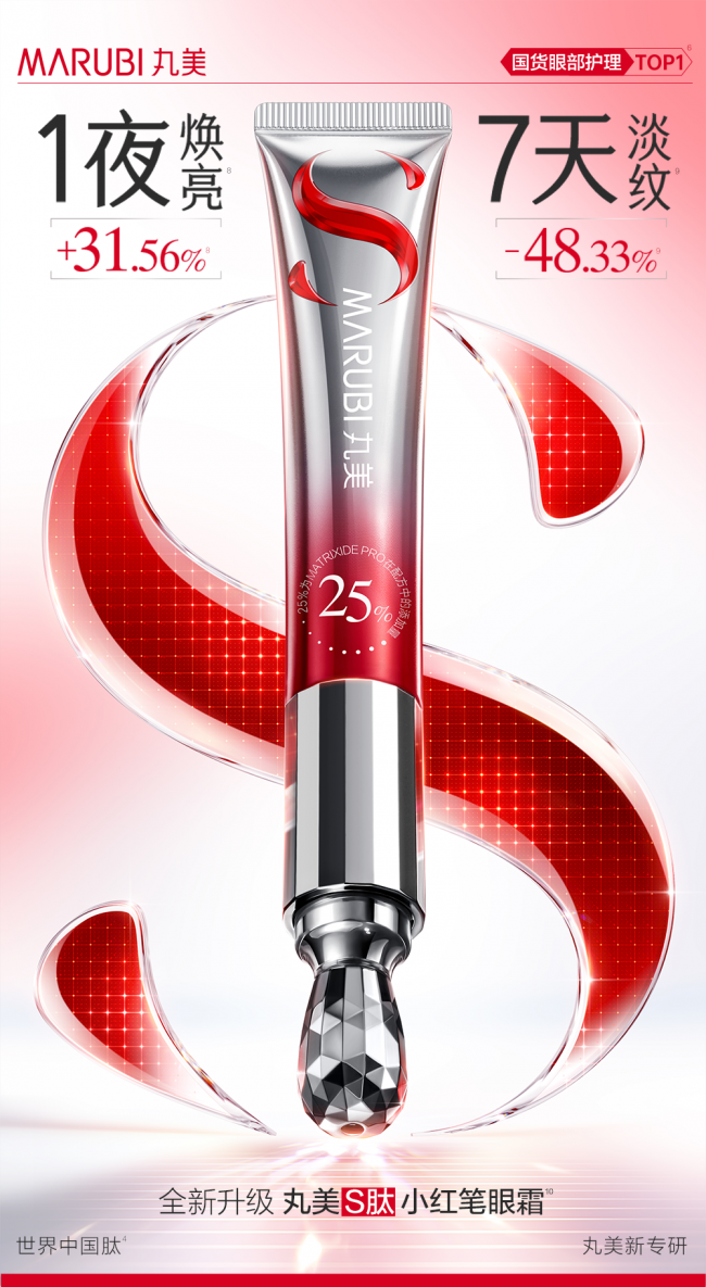 S肽小红笔眼霜以该核心成分为基础,经过分子、细胞、动物到人体的全流程科学验证,搭配高浓度胜肽精准配比与专利微电流按摩头,打造“成分创新+科技工具”的双重优势,精准改善眼周干纹、细纹、黑眼圈等多重初老问题。这款产品的上市,延续了丸美用硬核科研兑现品牌承诺、让护肤告别表面效果的初心,真正实现高效、精准、持久的抗衰体验。
