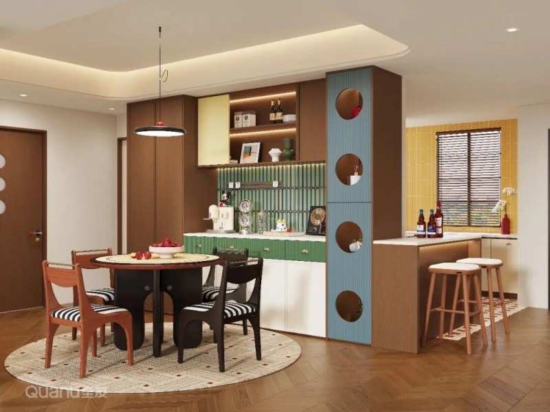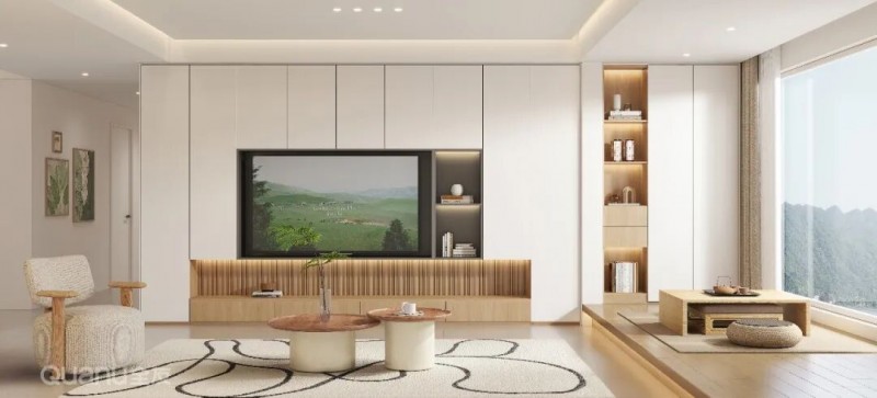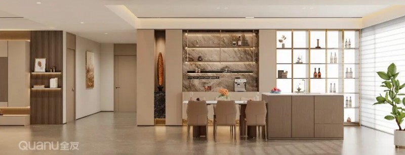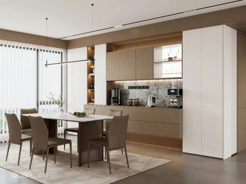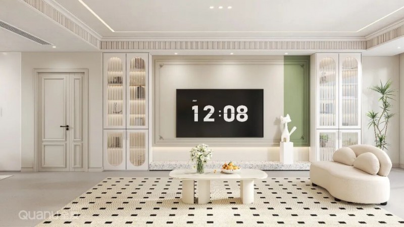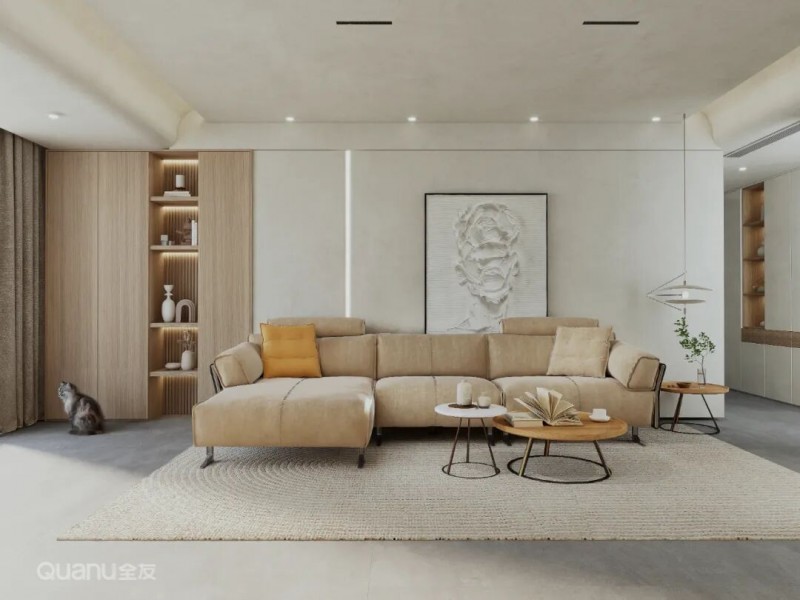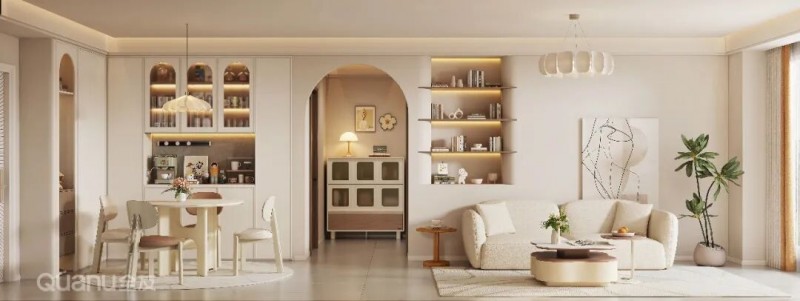 以米白、象牙白等浅色调为主,结合开放式布局,增强空间通透性与互动感,营造出开阔明亮的居住氛围。