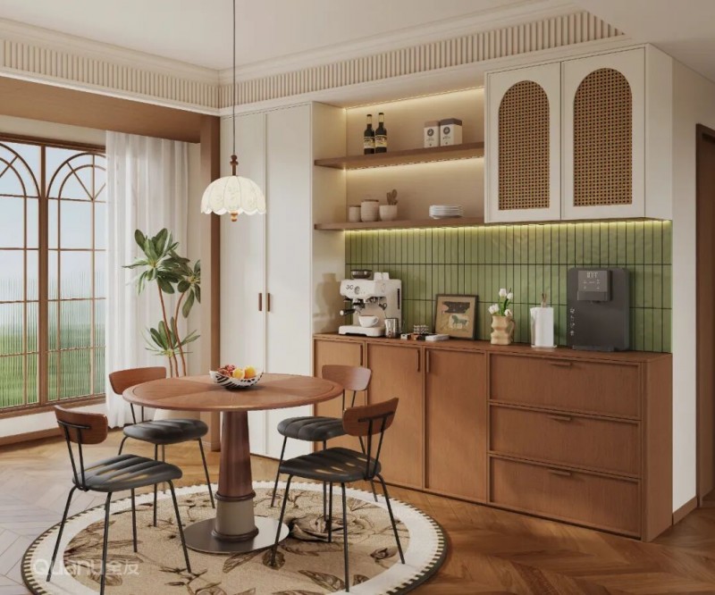 空间注重大面积留白,柜体多选用橡木、胡桃木等实木,呈现出舒适质朴的居家氛围。