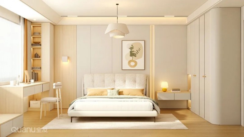 以奶油白、奶咖、米杏等低饱和暖色调为主色调,全屋色调统一柔和。