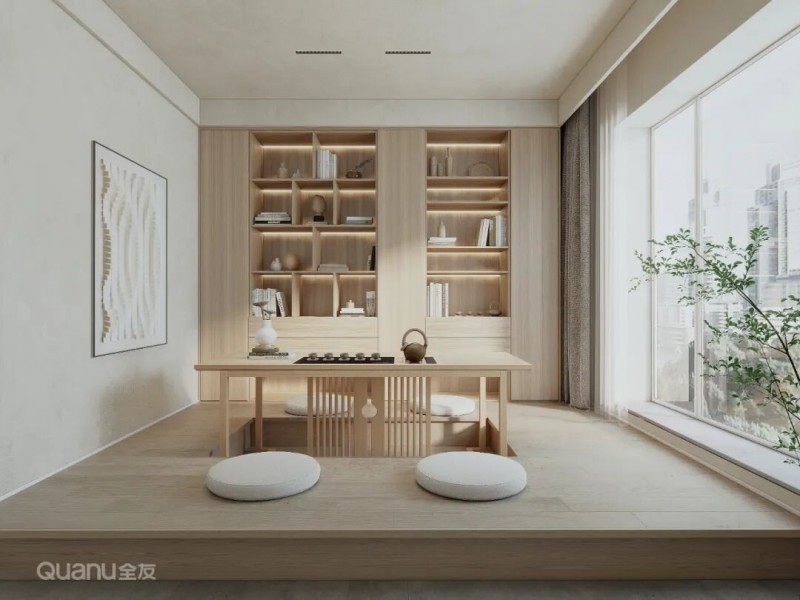 设计上追求极致留白,少做装饰。家具造型简约流畅,软装以棉麻、粗布为主,仅点缀少量绿植与陶艺摆件,整体避免冗余色彩与造型。