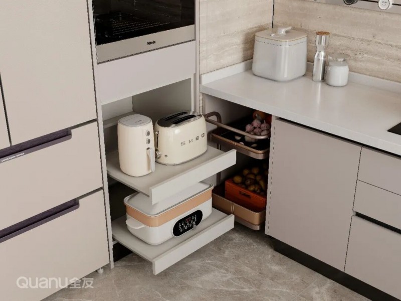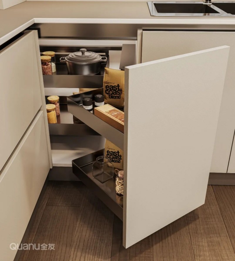 厨房转角区域常常被浪费,但只要配置一个转角拉篮,用来收纳锅具等大件物品,这片死角就能被充分利用起来。