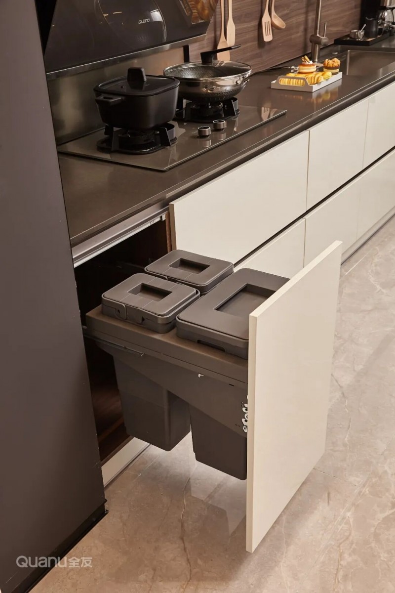 传统垃圾桶不仅占地方,还容易滋生蚊虫、散发异味。不如直接将垃圾桶嵌入橱柜内部,需要时轻拉即可使用,用完推回还能隐藏收纳,既释放了宝贵空间,又让厨房时刻保持干净卫生。