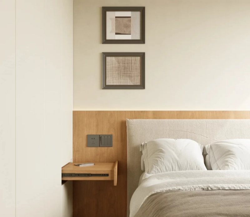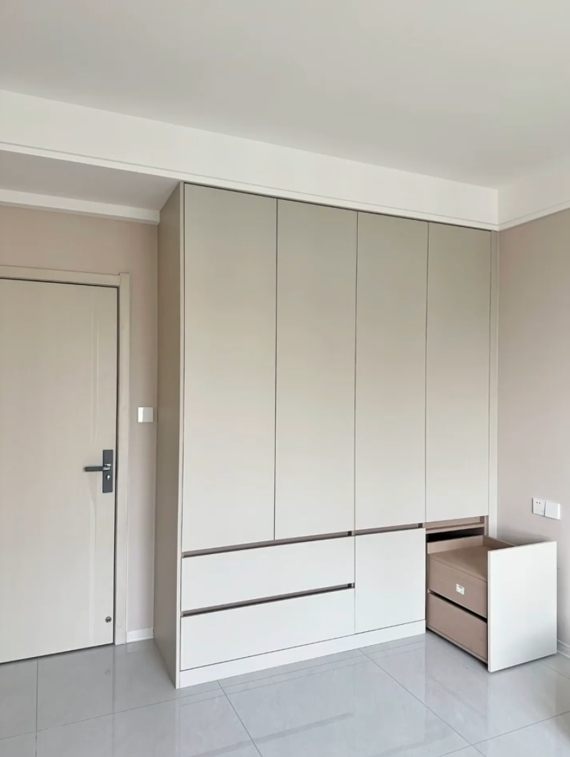 另一种是把床头柜直接嵌入衣柜,做成可推拉结构。拉开是实用床头柜,推回便与衣柜融为一体,既节省过道空间,又能实现隐形收纳。