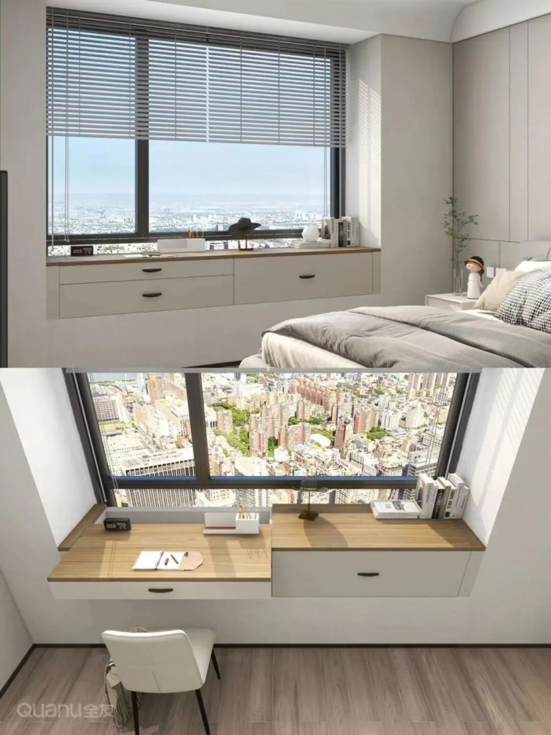 除此之外,闲置的飘窗也能巧妙利用起来。在飘窗处设计可推拉的抽屉桌面,平时推回不占过道空间,需要时拉出即可作为书桌或梳妆台使用,1㎡都不浪费~