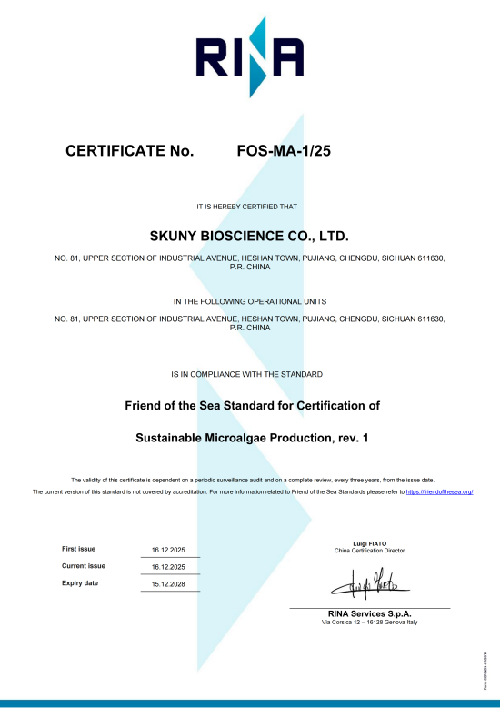 FOS海洋之友认证是国际非政府组织World Sustainability Organization(世界可持续发展组织)的一个项目,目前是世界上主要的可持续海产品认证计划,能证明,藻源乐健®产品的生产是可持续的、遵守社会责任原则的,并且整个生产过程中,废弃物不会超过8%,是环保可持续的。
