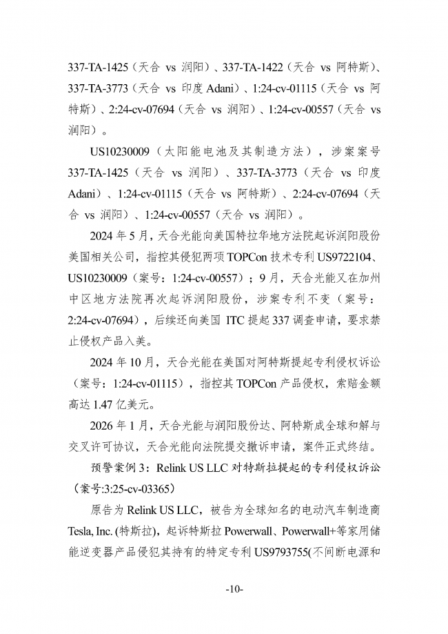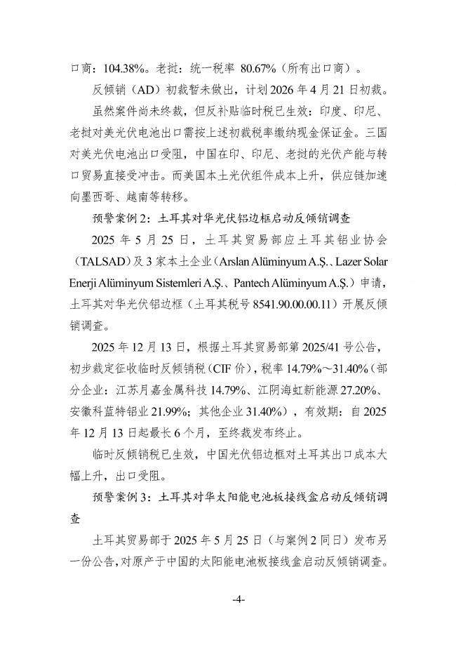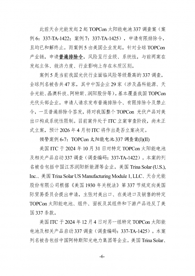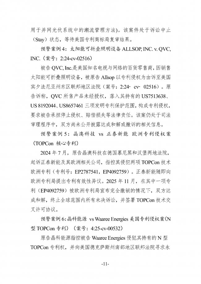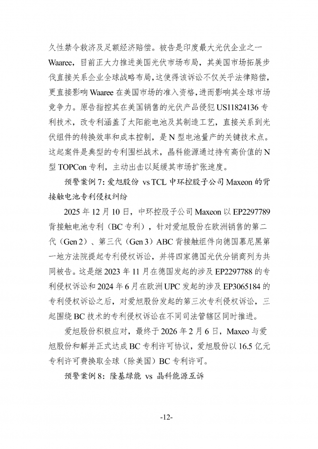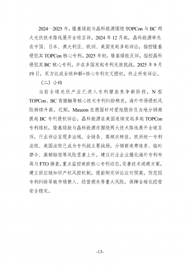 当前全球光伏产业已进入专利壁垒竞争新阶段,N型TOPCon、BC背接触等核心技术成为纠纷焦点,海外诉讼呈现多法域、全链条特征。美国、欧洲法院成为专利战主要战场,分销商连带追责、临时禁令、高额赔偿等风险显著上升。典型案例包括美国对东南亚三国光伏电池的“双反”调查、土耳其对华铝边框及接线盒反倾销调查,以及晶科与Waaree、隆基与晶科等企业间的全球专利互诉。行业需重点监控美欧核心专利动态,完善技术规避方案、建立供应链知识产权风控机制,提前制定诉讼应对预案,防范因专利纠纷导致市场禁入、经营损失等重大风险,保障全球化经营安全稳定。