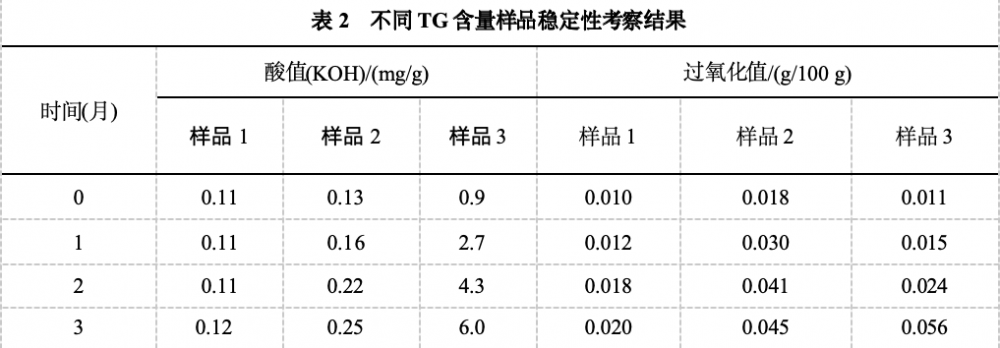 鱼油的氧化稳定性是影响产品质量和用户体验的关键。TG结构是自然界鱼油的天然存在形式,稳定性最强,研究表明,TG含量越高的鱼油,其稳定性越强[]。98nTG鱼油的加速稳定性试验也获得了同样的结果:通过3个月的加速试验显示,样品2(TG含量90.8%)的酸值和过氧化值有所增加;样品3(TG含量64.09%)的酸值和过氧化值显著增加,且酸值变化较大,说明产品稳定性较差;样品1-98nTG(TG含量98.23%)酸值和过氧化值几乎没有变化,说明98nTG的稳定性更好,也说明鱼油的TG含量越高产品稳定性越好。
