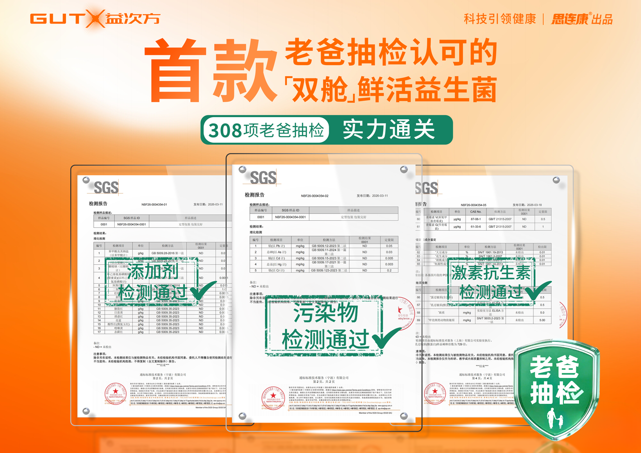 3、308项全方位审核:前沿技术的落地,必须建立在坚实的安全防线之上。在老爸抽检的严苛把关下,GUTX益次方接受了产品和工厂的双重审查:在产品端,成功通过了涵盖致病菌、重金属、塑化剂、激素及各类防腐剂、甜味剂等高风险物质的206项真实检测;在生产端,则经受住了覆盖生产环境、组装设备、原料把控等全生命周期的102项严苛工厂审核。凭借对品质的极致坚守,GUTX益次方在这两方面的核心核查中均取得全项通过的成绩,为消费者构筑起一道绝对安心的全方位健康防线。