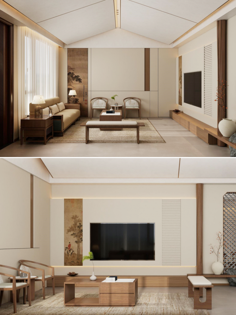 像一幅宋代山水画,只留风骨。强调留白和通透感,让光影自然洒落。