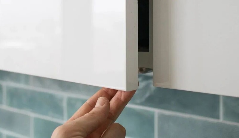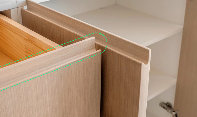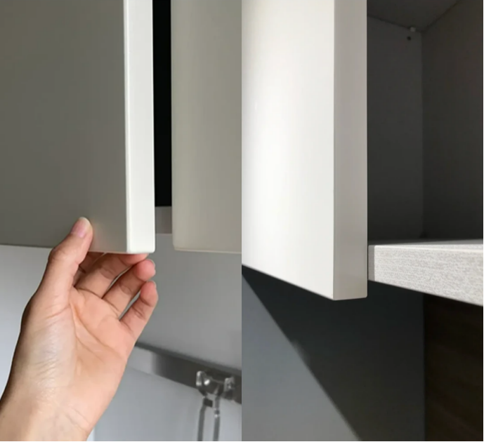 让柜门比柜体长出1-2厘米,利用延伸出来的部分作为拉手。不需要额外加装任何五金件,工艺简单,成本也低。用在吊柜、悬空柜这类位置再合适不过,轻轻一抠就能打开。