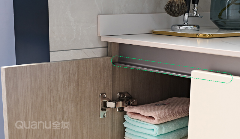 在柜体上开槽,把金属型材嵌入其中,再用结构胶和螺丝双重固定。相比传统外装拉手,这种内嵌方式更加牢固。橱柜、抽屉门板用得比较多,触感利落,也经得起日常频繁开合。