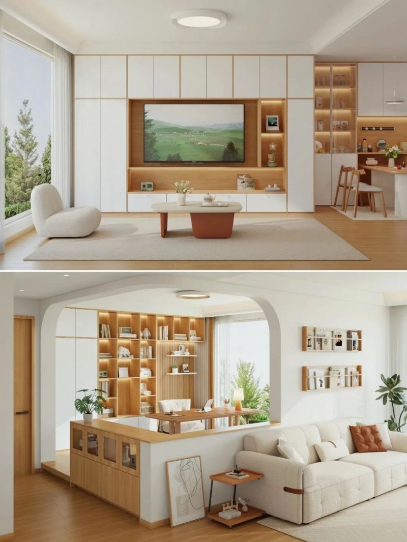 怕原木风沉闷的可以选这个。在温馨原木的基础上,柜子尽量选大面积白色,再点缀几株绿植,拥有满满的清新感。不厚重不压抑,温馨又有呼吸感。