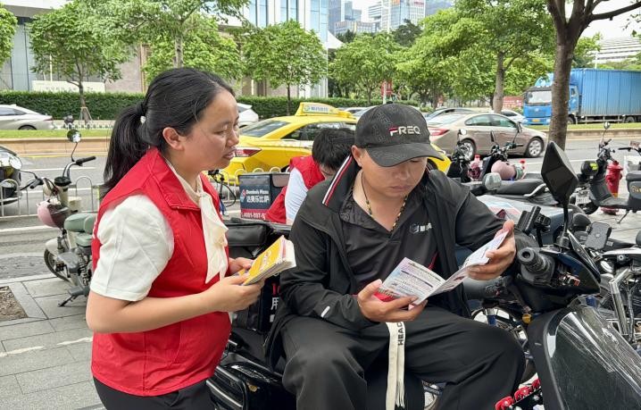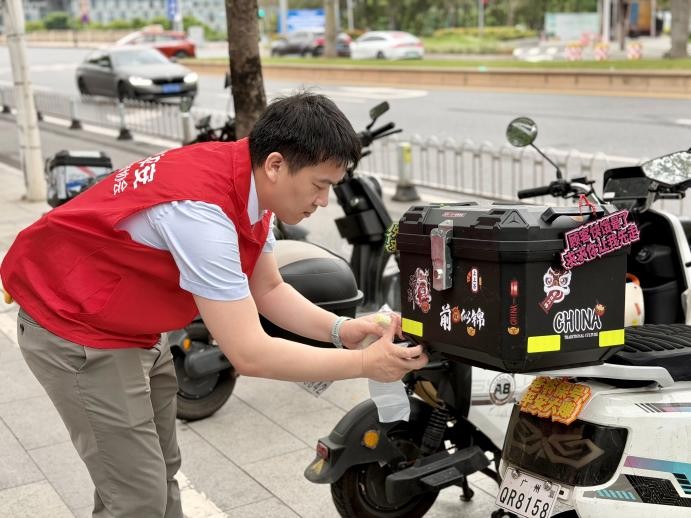 值得一提的是,平安产险广东分公司的"风险减量"服务,并没有止步于展馆之内。针对广交会期间人流车流密集的特点,团队特别启动了"亮尾行动"。平安志愿者们为现场的外卖骑手、市民免费张贴高反光标识贴,并现场指导佩戴安全头盔、遵守交通规则。"晚上赶车看不清后面来车,贴上这个反光条,心里更有底了。"一位外卖小哥在接过反光贴后说道。
