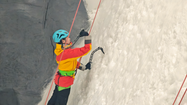 在ICE PANDA室内攀冰馆,眼前是一座12.5米高的专业冰壁,冰面上清晰可见攀爬用的冰镐与冰爪印痕。几名身着专业装备的攀冰爱好者正在不同难度线路上交替上行,冰屑飞溅,引来阵阵喝彩。