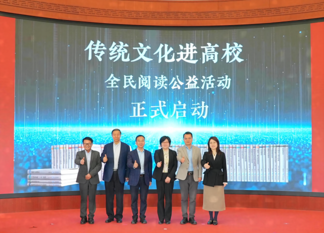 随后,陈静社长,赵留彦副院长,北京发行集团有限责任公司党委副书记、总经理徐威,北京大学出版研究院副院长李世娟,中华出版促进会文化出版合作国际事务工作委员会主任委员李大伟共同启动“传统文化进高校暨全民阅读公益活动”。