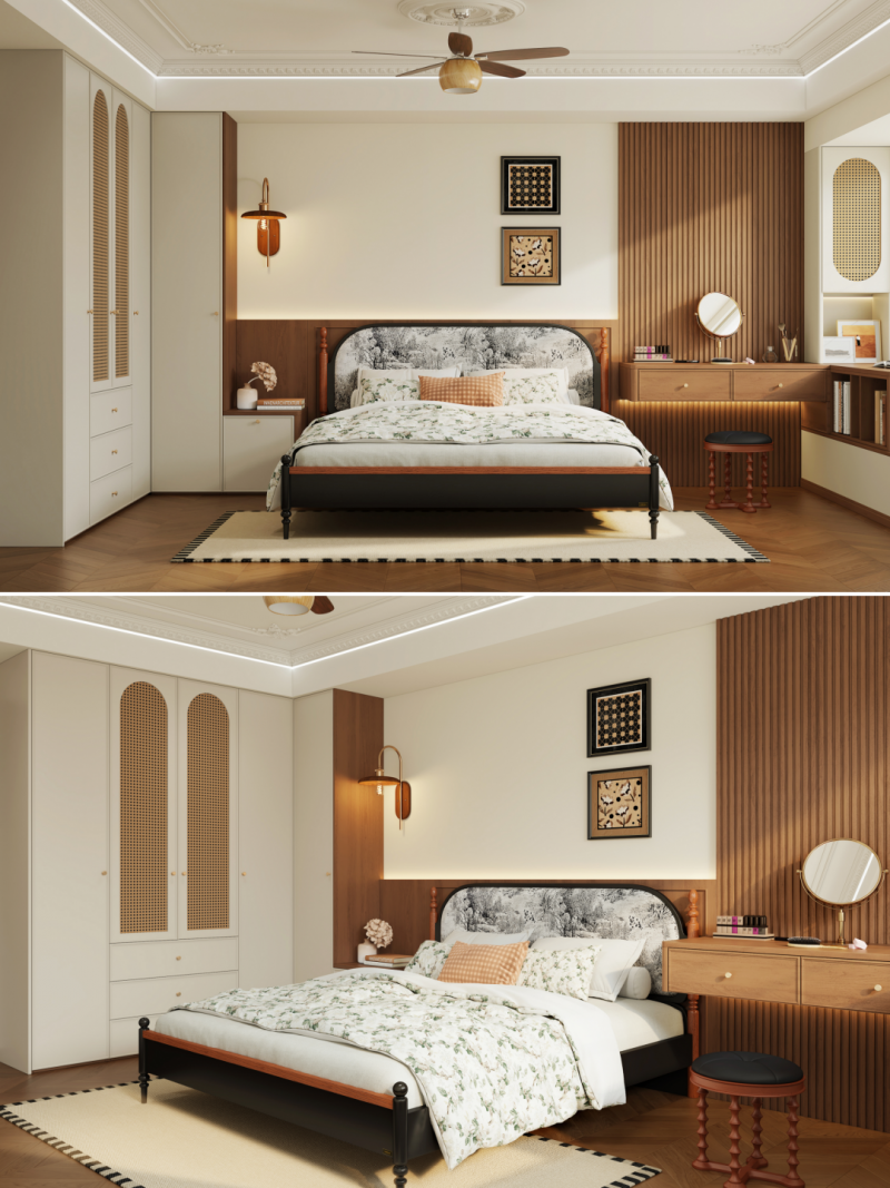 护墙板与中古家具搭配,氛围感十足。L型转角衣柜兼顾床头柜功能,靠窗定制梳妆台与储物柜,每一寸空间都不浪费。