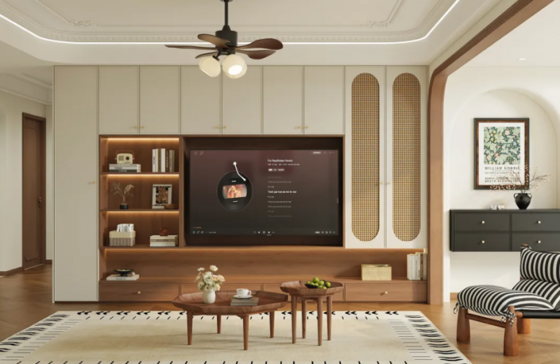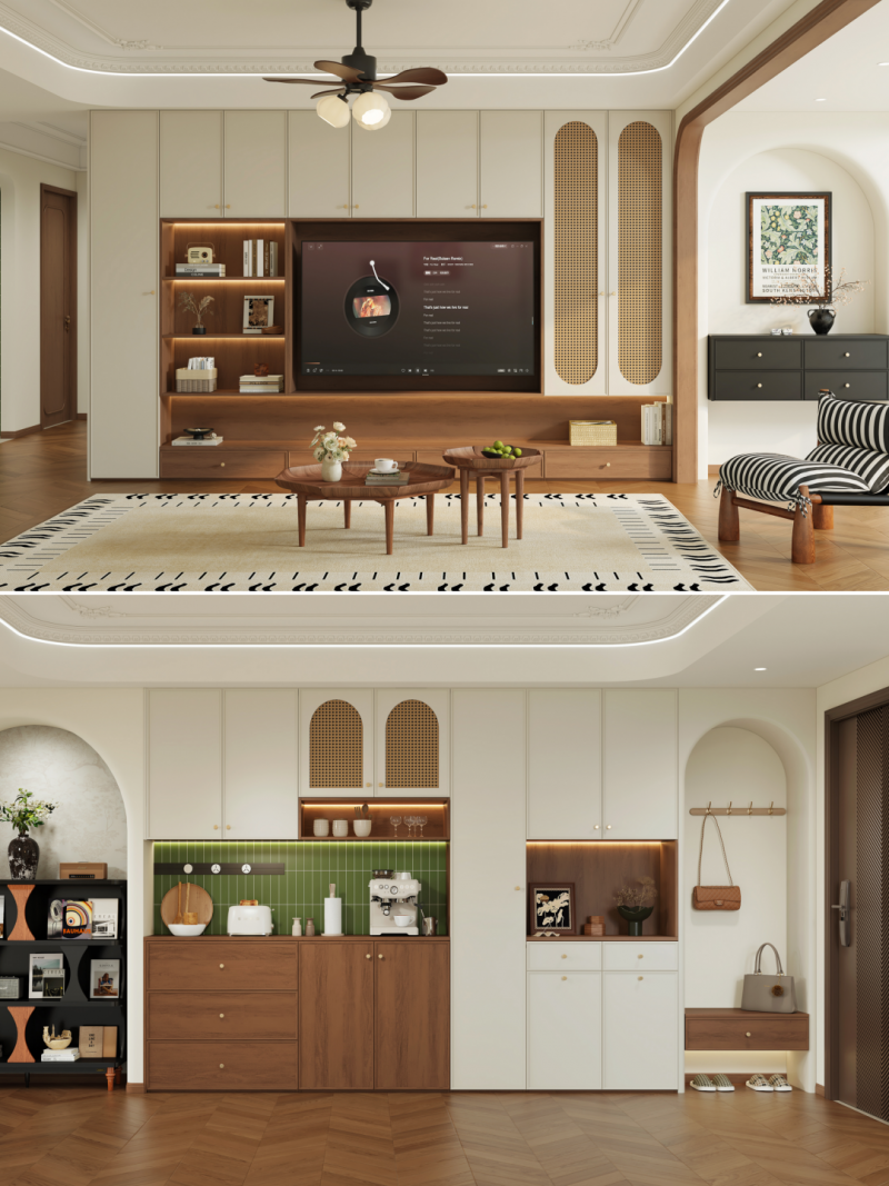 满墙电视柜,收纳力直接拉满。骨骼线、藤编与黄铜拉手点缀,营造出优雅复古的家居格调。开放格内嵌灯带,更添几分灵动。黑莓色阳台柜色调浓郁,格外特别。