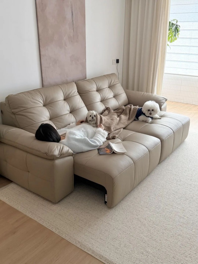 多形态切换:收起时是直排沙发,单座展开秒变贵妃位,小憩时全展开充当小床,怎么躺都舒服。