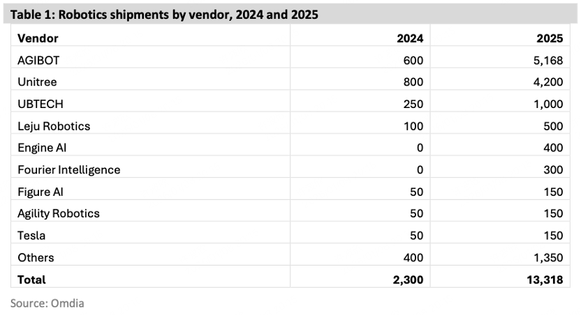 提要:1月9日,研究机构Omdia最新发布的行业报告显示,2025年全球人形机器人市场迈入高速增长阶段,出货量达1.3万台,反映出该品类在多应用场景下的商业化落地进程正在加速。这当中,中国企业主导全球人形机器人市场格局:智元机器人以5168台的出货量位居榜首,占据全球39%的市场份额;宇树科技与优必选分列二、三位,出货量分别是4200台和1000台。
