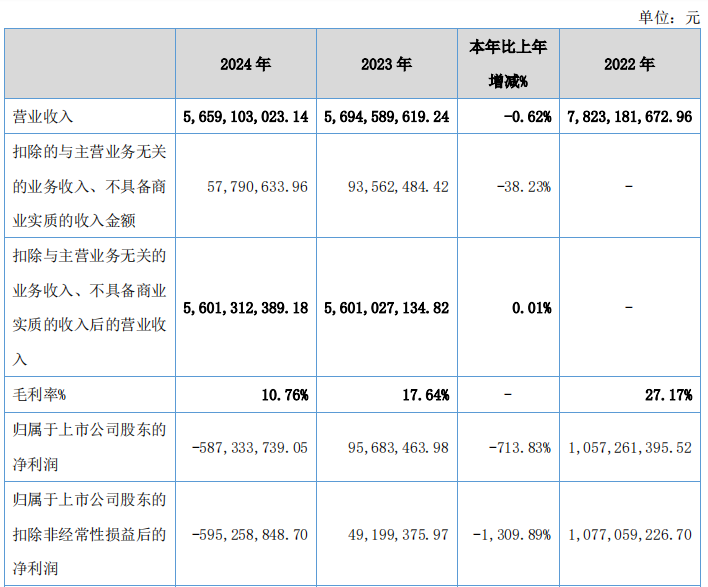 2024年,公司营业收入为56.59亿元,同比下降0.62%;归属于上市公司股东的净利润为-5.87亿元,同比下降713.83%;归属于上市公司股东的扣除非经常性损益的净利润为-5.95亿元,同比下降1309.89%。