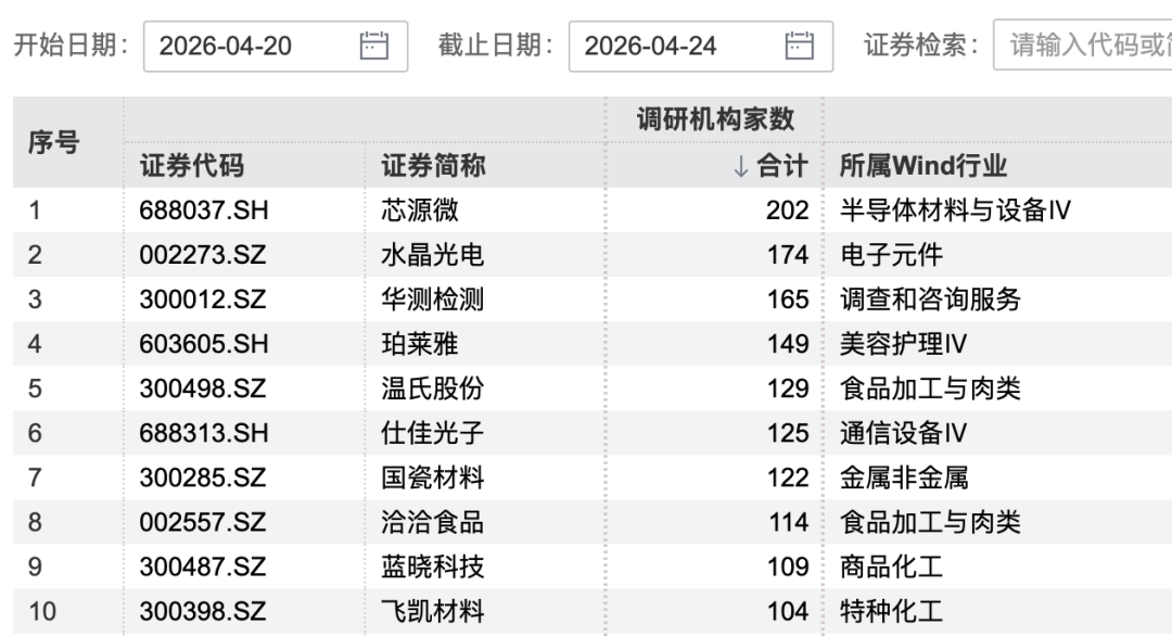 4月20日至4月24日机构调研总次数排名前十情况图片来源:Wind
