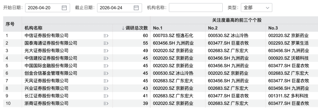 4月20日以来,1247家机构调研A股上市公司。中信证券调研总次数最多,为60次。从调研情况看,京新药业等个股受青睐。